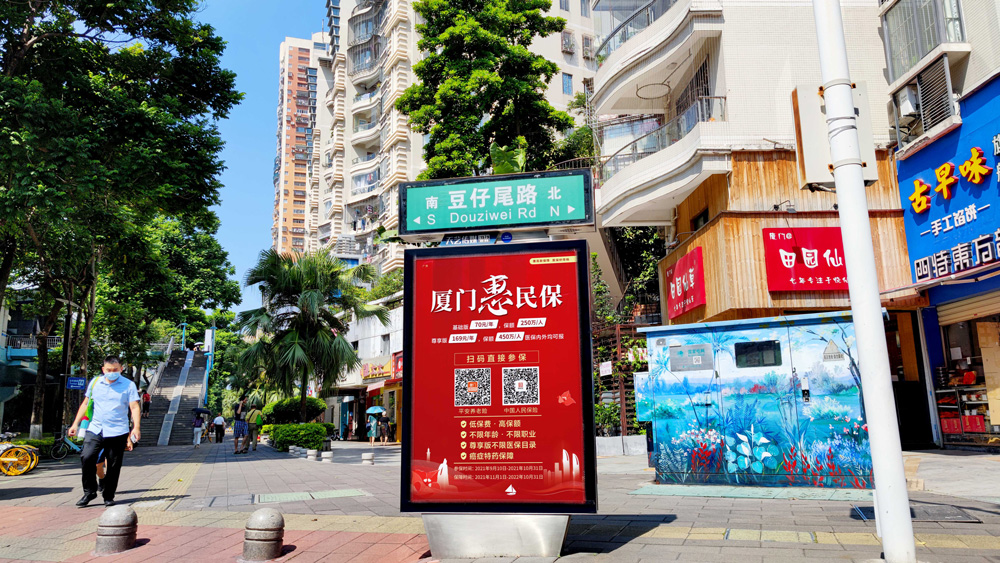 路牌及候車亭廣告畫面以“廈門惠民保”的四大優(yōu)勢以及參保二維碼(平安養(yǎng)老險、中國人民保險)為主進(jìn)行宣傳,讓廈門人民在抗疫期間,多一份保障也多一份安心的守護(hù)。