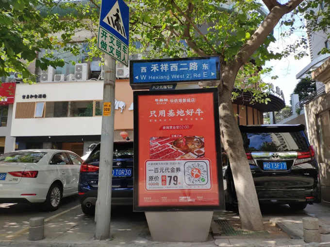 牛基地與天藝傳媒強強聯(lián)手,精準宣傳將?;厝A僑海景城店附近的城市路名牌戶外媒體進行定點宣傳。